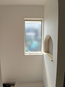 さらに、このナチュラルな雰囲気を壊さないよう、玄関やキッチンの間仕切り、小窓には… ニチベイのロールスクリーン を設置しました💡